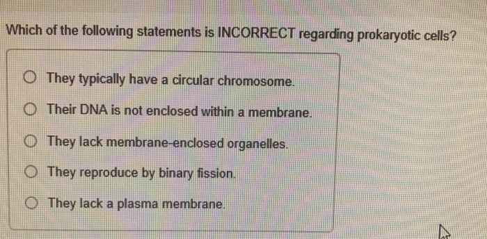 Which of the following statements is incorrect. 1 Which of the following statements is INCORRECT regarding prokaryotic cells. 1 Which of the following statements is INCORRECT regarding prokaryotic cells.